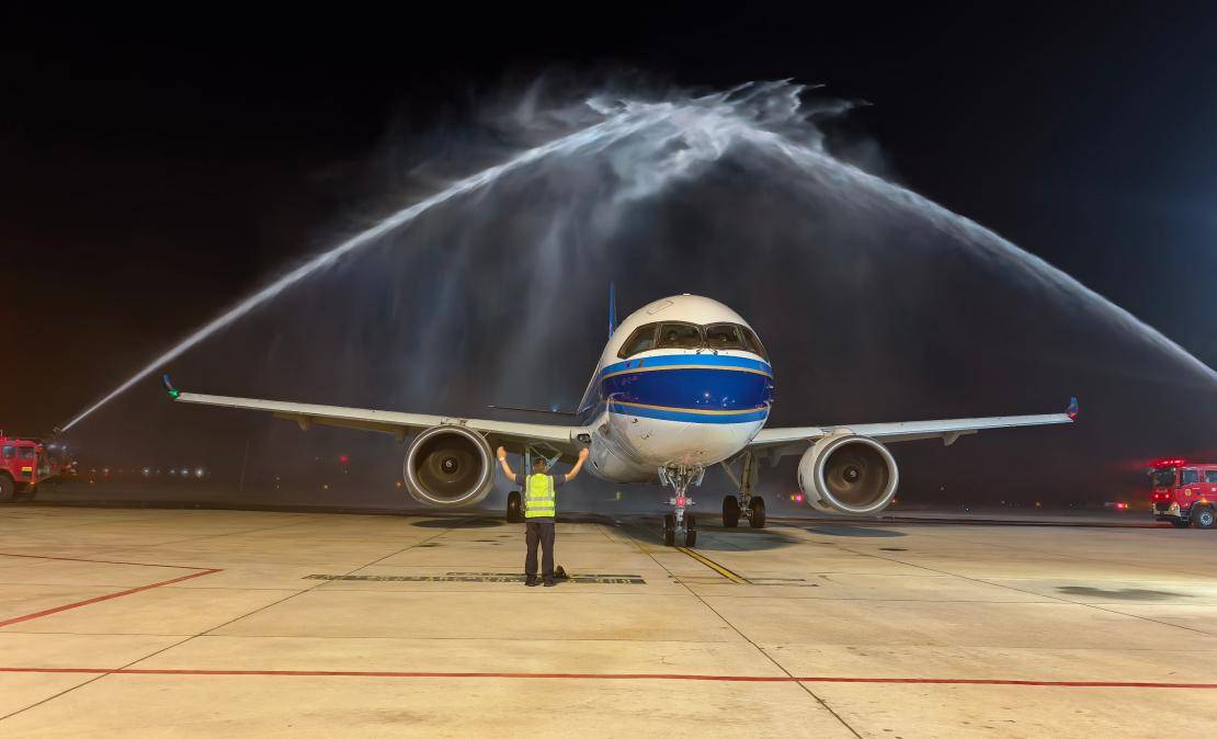6月4日22时21分,中国南方航空由国产大飞机C919执飞的CZ3383次航班,搭载着139名旅客从广州白云国际机场起飞,于6月4日23时57分降落在河南南阳姜营机场。国产大飞机C919商业运营再添新航线,这也是C919飞机首次正式亮相国内支线机场。国产大飞机C919为助力加快“干支通,全网联”的我国现代化航空运输网络体系建设,迈出关键一步。
