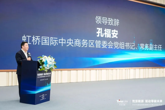 虹桥国际中央商务区管委会党组书记、常务副主任孔福安致辞,他表示,虹桥国际中央商务区作为承载多重国家战略使命的重要区域,具备区位优越、政策集成、营商环境优质、人才资源丰富等综合优势,为天合光能这样的优质企业引领全球的光伏智慧能源产业高地提供舞台与沃土。此次发布会的成功举办,正是天合光能全球化战略与虹桥“链接国际、服务全国”功能定位高度契合的生动体现。