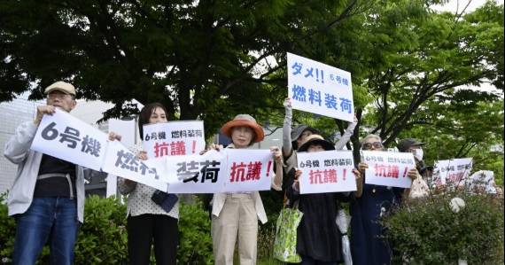 日本新潟县的市民团体10日在新潟市的东京电力公司新潟总部前举行抗议集会,反对柏崎刈羽核电站6号机组装填核燃料。集会参加者手拿写有“抗议6号机组燃料装填!”等字样的标语纸和横幅。