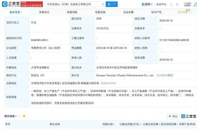 近日,中石化燕山(天津)石油化工有限公司成立,注册资本7.27亿元,经营范围包含:技术服务、技术开发、技术咨询、技术交流、技术转让、技术推广等。企查查股权穿透显示,该公司由中国石化(600028)全资持股。