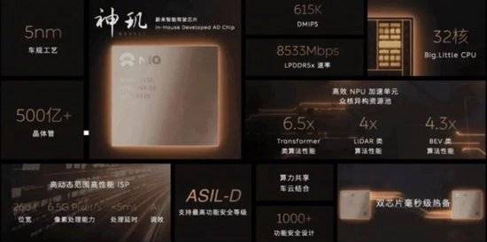 蔚来在芯片研发上早有布局,2024年7月,蔚来宣布已成功流片的自研智驾芯片定名为“神玑NX9031”。该芯片基于5nm车规工艺制造,拥有超过500亿颗晶体管,芯片和底层软件均实现自主设计,拥有32核CPU,集成了高动态范围的高性能ISP,以及自研的推理加速单元NPU。今年4月上海车展上,蔚来创始人、董事长李斌表示,“神玑NX9031”已开始量产上车。