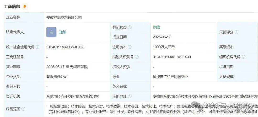 工商信息显示,安徽神玑技术有限公司成立于2025年6月17日 ,注册地址与蔚来中国总部一致,均位于安徽省合肥市经济技术开发区的恒创智能技术园,法定代表人为白剑。白剑于2020年11月加入蔚来,目前担任蔚来芯片部门以及智能硬件的负责人,此前曾担任小米芯片和前瞻研究部门总经理。该公司注册资本1000万人民币,经营范围包括技术服务、技术开发、技术咨询、技术交流、技术转让、技术推广;集成电路芯片设计及服务;集成电路芯片及产品销售;集成电路设计;知识产权服务;专业设计服务;软件开发;软件销售;人工智能应用软件开发等。