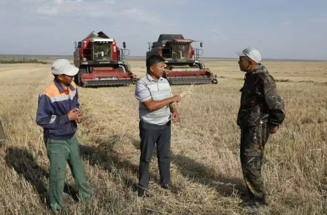 ▲ 2022年9月2日,在哈萨克斯坦北哈萨克斯坦州,与爱菊集团合作的农场主在收割。新华社发(奥斯帕诺夫摄)
