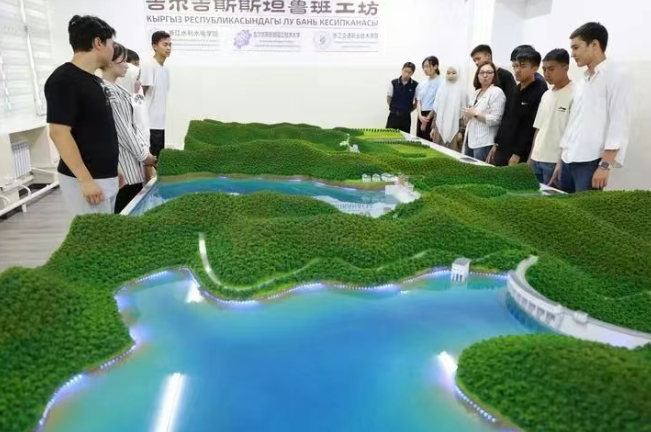 ▲ 2025年6月4日,在吉尔吉斯斯坦首都比什凯克,师生在吉尔吉斯斯坦鲁班工坊水利枢纽工程模拟演示实验室学习水电站知识。新华社发(罗曼摄)