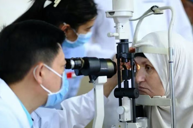 ▲ 2024年6月12日,在塔吉克斯坦首都杜尚别,中方医生在“健康快车塔吉克斯坦光明行”活动期间为患者进行检查。新华社记者 郑开君 摄