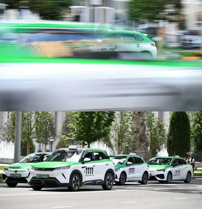 ▲ 在塔吉克斯坦首都杜尚别,中国新能源汽车行驶在道路上(拼版照片,上图摄于2025年5月28日,下图摄于2025年5月29日)。新华社记者 李任滋 摄