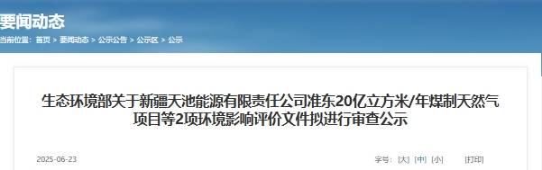 生态环境部6月23日发布公示,拟对新疆天池能源有限责任公司准东20亿立方米/年煤制天然气项目和国家能源集团准东20亿立方米/年煤制天然气项目的环境影响评价文件进行审查。两大煤制天然气项目均位于新疆准东经济技术开发区,总投资合计约340.8亿元。