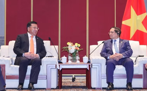 6月24日下午,越南总理范明政在天津出席第十六届夏季达沃斯论坛期间,密集会见中国中铁、中国铁建、中国交建及中国银行等重点中资企业负责人,积极推动中越两国在基础设施建设、贸易和投资等领域的全面深化合作。范明政特别强调中越跨境铁路合作的重要性,明确提出推动老街—河内—海防铁路项目于今年12月正式开工。