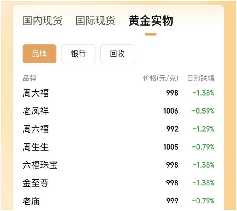 25日国内金饰价格普遍下跌,单克纷纷跌至千元前后。周大福足金价格为998元/克,单克较前一日下跌14元;老庙黄金为999元/克,单克较前一日下跌8元;老凤祥为1006元/克,较前一日下跌6元;周生生金饰价格为1005元/克,较前一日下跌8元。