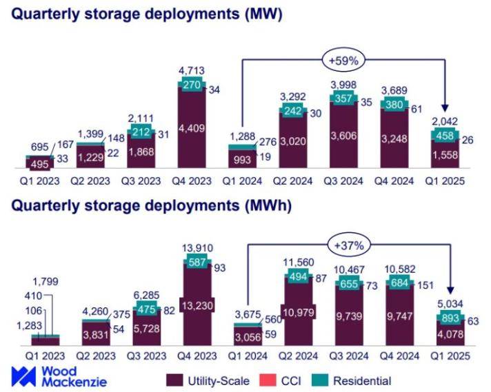 美国公用事业规模储能市场处于领先地位,2025 年第一季度新增容量 1.5 GW/4 GWh,比去年同期增长 57%。