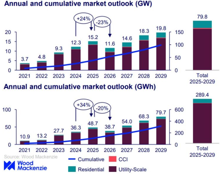 到 2029 年,住宅储能安装量将接近 15 吉瓦,增长速度与 2025 年第一季度相似。加州的 NEM 3.0 实施是住宅市场的主要驱动力,因为纳税人寻求储存多余的能源,而不是将其输送到电网。