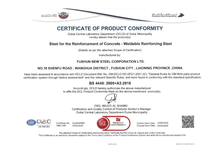 该认证是公司继取得英标、韩标等国外钢筋认证后,在国外钢筋认证的又一里程碑,标志着公司生产的建筑用钢筋正式获得进入阿联酋迪拜市场的资格证,为拓展中东高端基建市场奠定了坚实基础。