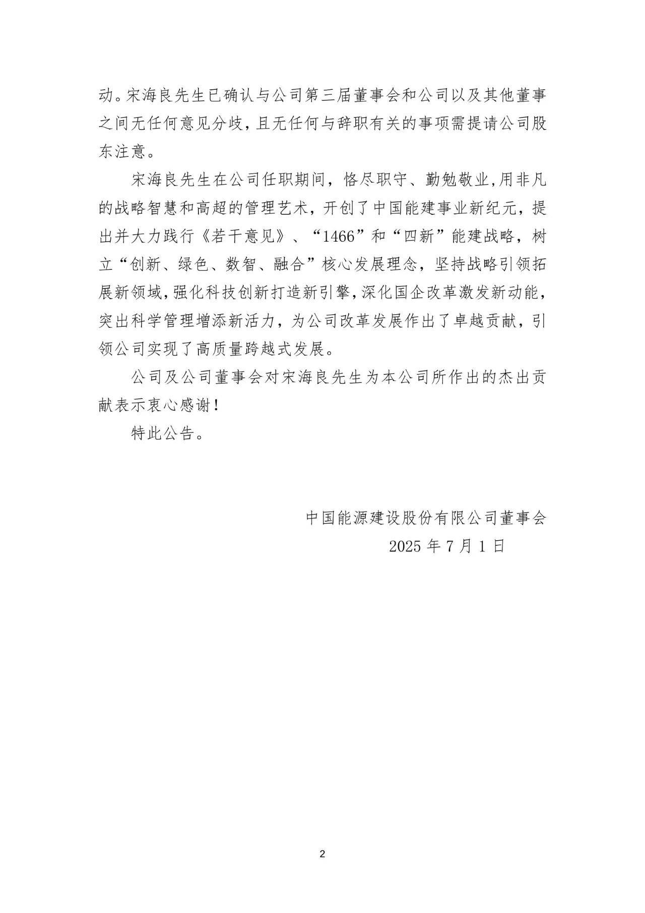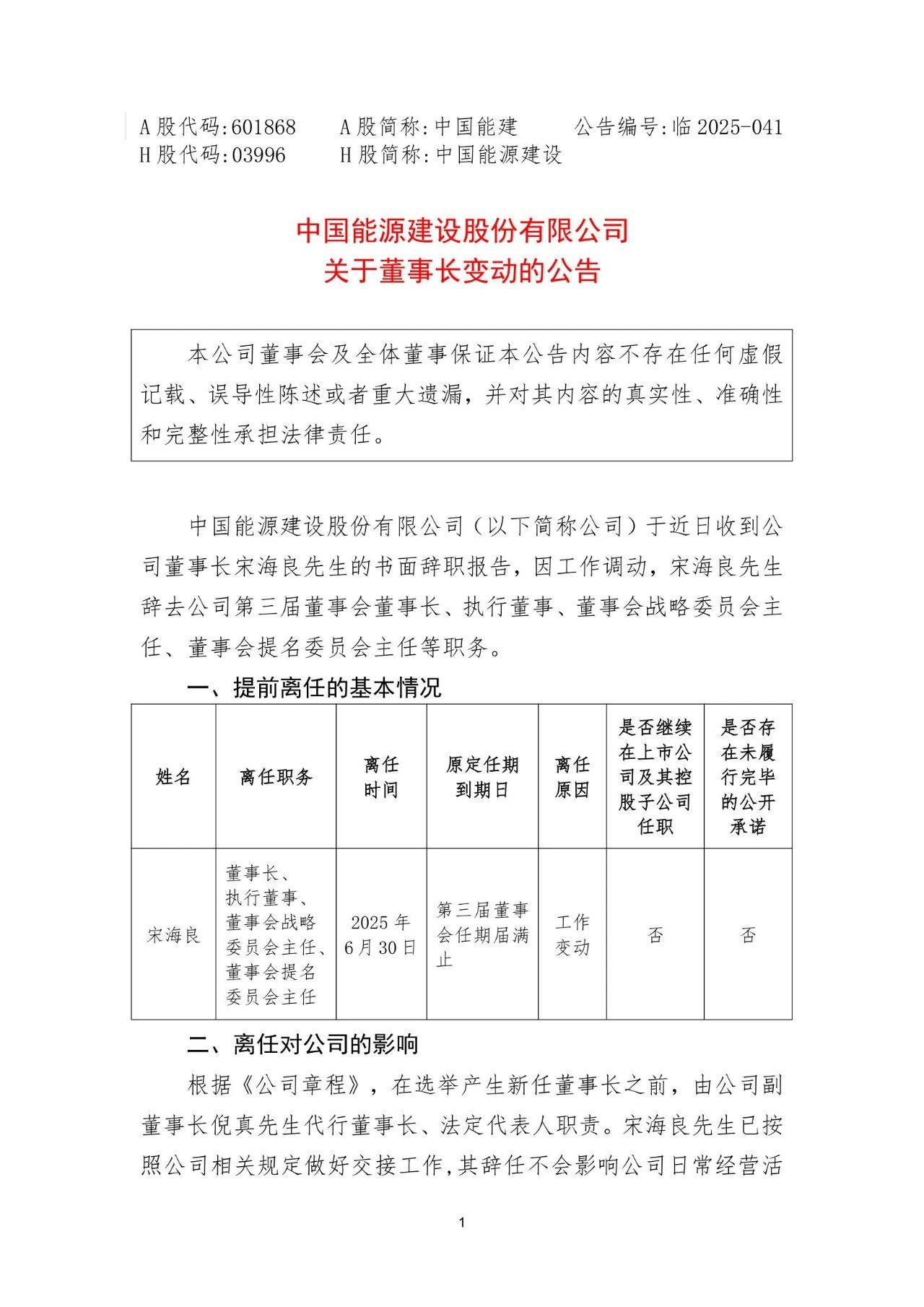 刚刚,中国能源建设股份有限公司(以下简称“中国能建”)发布公告。公告表示,中国能建于近日收到公司董事长宋海良先生的书面辞职报告,因工作调动,宋海良先生辞去公司第三届董事会董事长、执行董事、董事会战略委员会主任、董事会提名委员会主任等职务。
