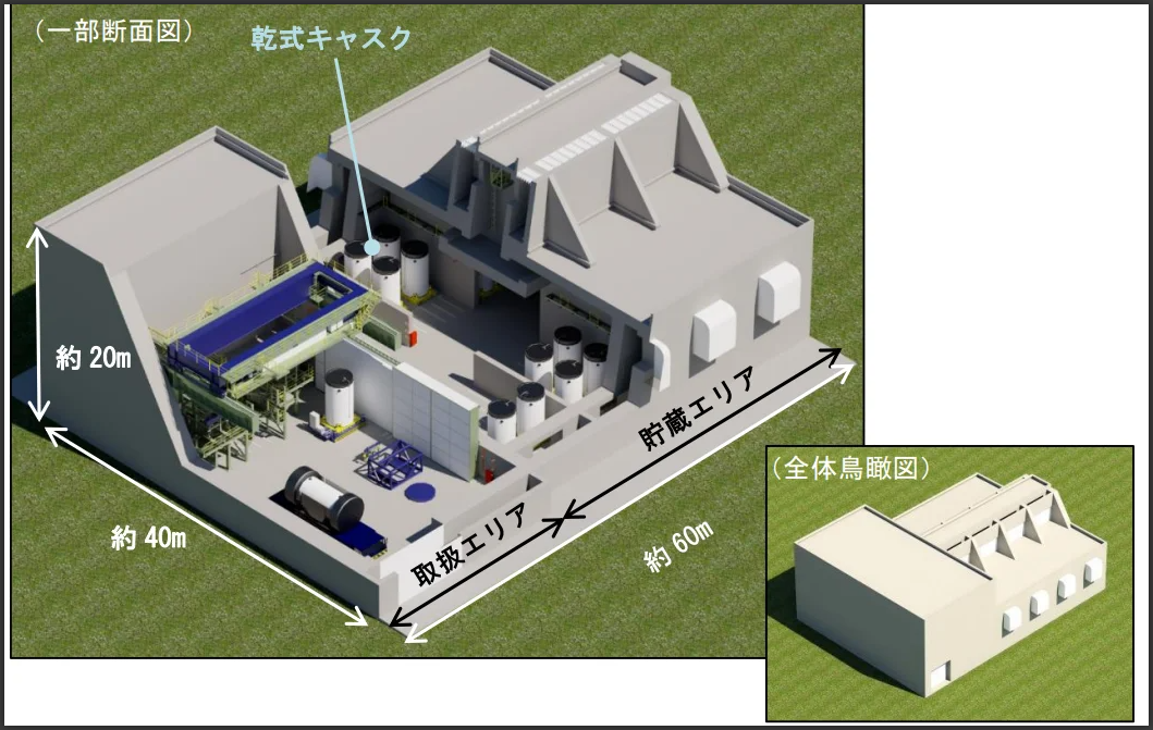 现已投入运营的干式储存设施是一座钢筋混凝土建筑,东西约40米、南北约60米、高20米,储存容量相当于45个干式储存罐,最多可储存约1200个燃料组件。所使用的干式储存罐具备密闭、防止临界、屏蔽和散热四种安全功能,还可作为运输容器,便于将乏燃料运出电厂。