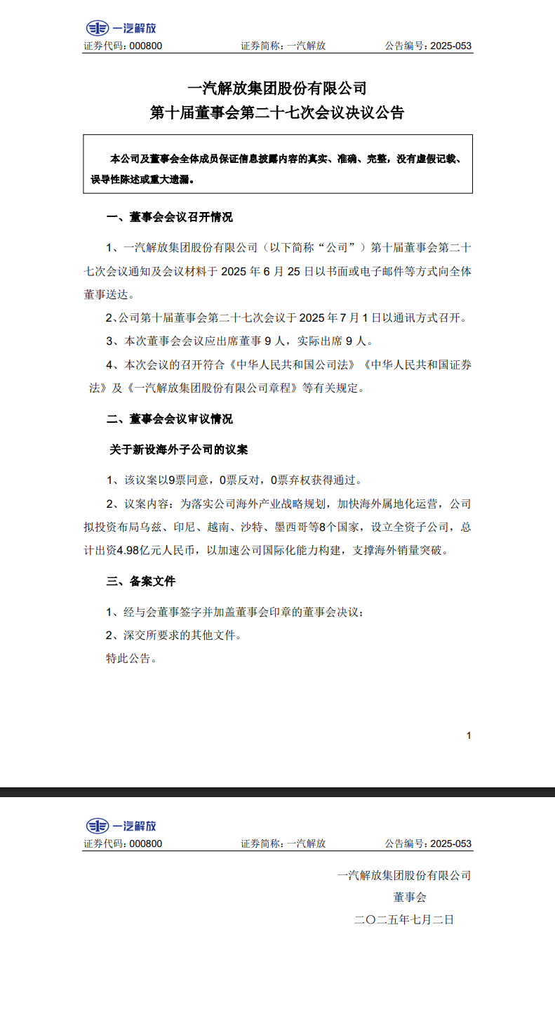 7月1日,一汽解放召开第十届董事会第二十七次会议,审议通过《关于新设海外子公司的议案》。为全面落实一汽解放海外产业战略规划,加快海外属地化运营,一汽解放拟投资布局乌兹别克斯坦、印度尼西亚、越南、沙特阿拉伯、墨西哥等8个国家,设立全资子公司,总计出资4.98亿元人民币。
