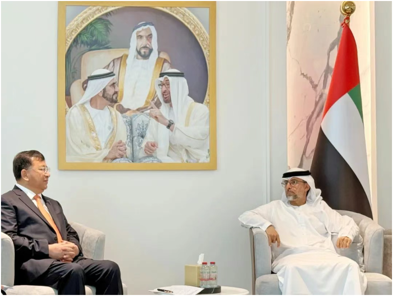 当地时间7月4日,中国铁建党委书记、董事长戴和根在迪拜与阿联酋能源与基础设施部部长兼阿提哈德水电公司董事长苏海尔・穆罕默德・马兹鲁伊举行会谈,双方就深化基础设施建设与能源领域的务实合作进行友好交流。