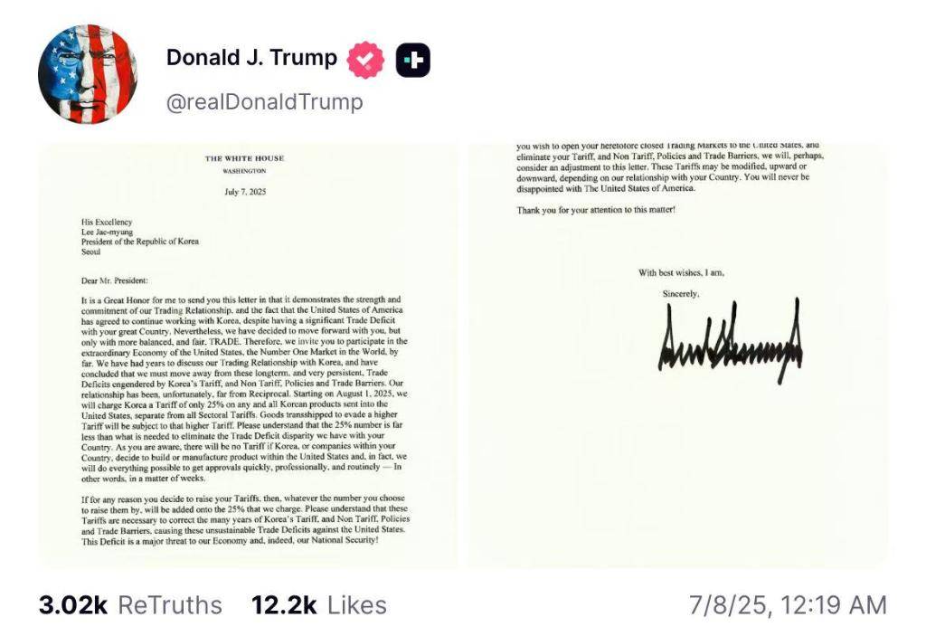特朗普警告称,如果日韩两国以提高关税作为回应,美国也将在25%的基础上再提高同等额度的关税。