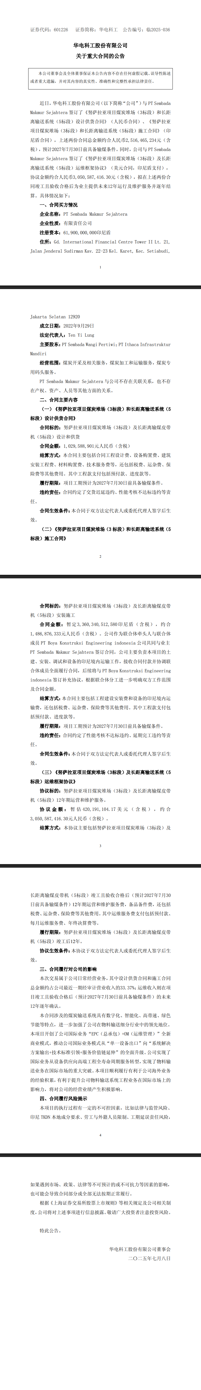 公告显示,公司与PT Sembada Makmur Sejahtera签订了《努萨拉亚项目煤炭堆场(3标段)和长距离输送系统(5标段)设计供货合同》、《努萨拉亚项目煤炭堆场(3标段)和长距离输送系统(5标段)施工合同》及《努萨拉亚项目煤炭堆场(3标段)及长距离输送系统(5标段)运维框架协议》,总金额约合人民币25.16亿元(含税)。预计2027年7月30日前具备输煤条件。同时,公司与PT SembadaMakmur Sejahtera签订了《努萨拉亚项目煤炭堆场(3标段)及长距离输送系统(5标段)运维框架协议》(美元合同,印尼盾支付),协议金额约合人民币30.51亿元(含税),拟在上述两份合同竣工且验收合格后为业主提供未来12年运行及维护服务并逐年结算。