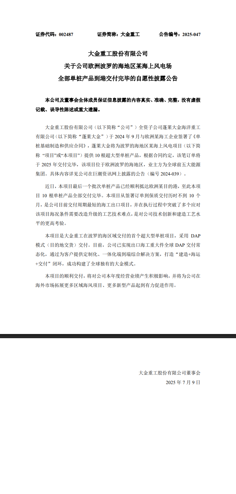 公告显示,大金重工股份有限公司(以下简称“公司”)全资子公司蓬莱大金海洋重工有限公司(以下简称“蓬莱大金”)于 2024 年9月与欧洲某海工企业签署了《单桩基础制造和供应合同》,蓬莱大金将为波罗的海地区某海上风电项目(以下简称 “项目”或“本项目”)提供 10 根超大型单桩产品,根据合同约定,该笔订单将于 2025 年交付完毕,该项目位于欧洲波罗的海地区,业主方为全球前五大能源集团。