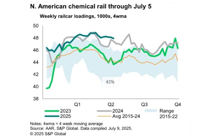 截至7月5日当周,北美化学品铁路车辆运输总量为46,151车,较前一周下降5.0%,同比增长0.7%。四周移动平均值(4wma)为47,920车,较上一周下降0.4%,同比增长1.0%,较季节性趋势线(以2015-2024年平均值为代表)上涨9.9%(左图)。