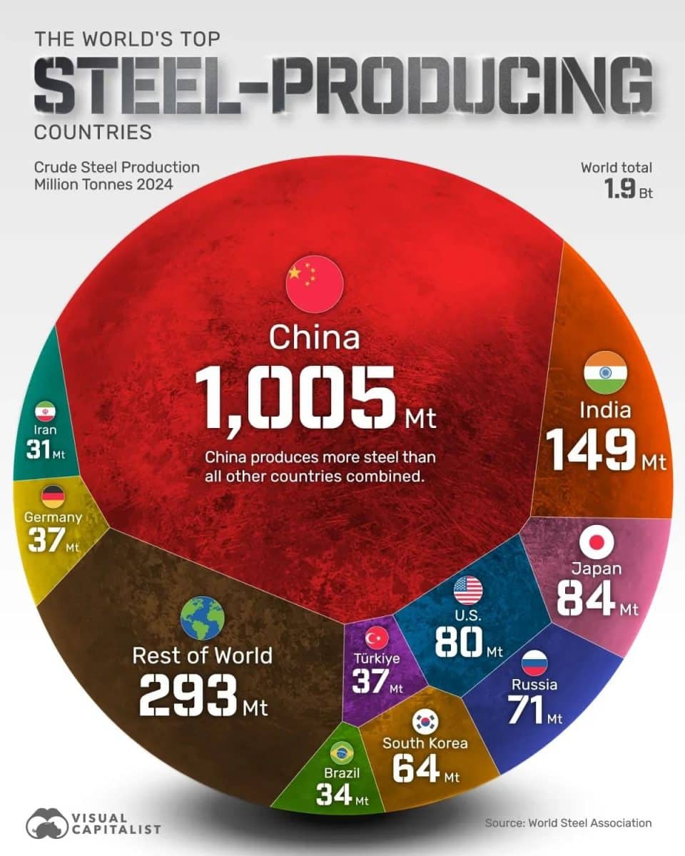 根据世界钢铁协会数据,中国当前钢铁产量超过全球其他国家总和。其中,仅中国宝武集团去年钢铁产量便达1.301亿吨,超越其他任何国家。