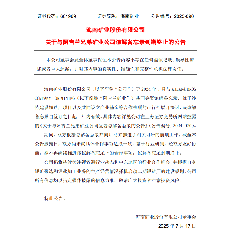 7月16日,海南矿业发布关于与阿吉兰兄弟矿业公司谅解备忘录到期终止的公告。公告显示,海南矿业股份有限公司于 2024 年7 月与AJLAN& BROSCOMPANY FOR MINING(以下简称“阿吉兰矿业”)共同签署谅解备忘录,就于沙特建设锂盐厂项目以及共同设立产业基金等合作事项的可行性展开探讨,该谅解备忘录自签订之日起一年内有效。期间,双方根据谅解备忘录共同启动并推进了相关可研的前期工作,截至本公告披露日,双方尚未就具体合作事项达成一致。基于行业研判,经双方友好协商,拟不再继续推进该谅解备忘录下的合作事项,谅解备忘录到期终止。