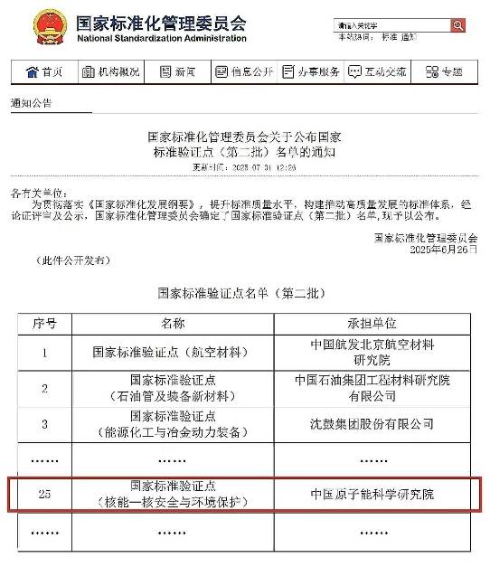 近日,国家标准化委员会公布了第二批共计35家国家标准验证点名单,中国原子能科学研究院成功获批“核能-核安全与环境保护”领域国家标准验证点,成为核工业领域仅有的两家国家标准验证点之一。这标志着原子能院在标准化工作方面再获重要突破,在核安全与环境保护标准化领域的影响力将进一步提升,为核能高质量发展提供强有力的技术支撑和规范引领。