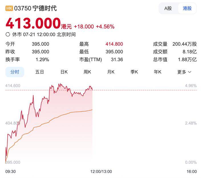7月21日,宁德时代AH股同步攀升,A股日内涨幅超3%,股价突破280元关口,创年内新高;H股涨超4%再创上市以来新高。截至发稿,宁德时代H股股价上涨4.56%,报413港元,成交额8.18亿港元。