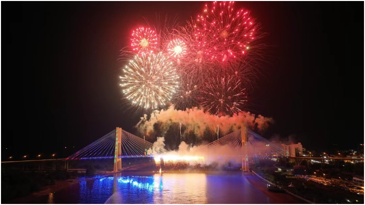 通车仪式在格美纳河畔举行,来自政府、业主、公众等五千余名嘉宾和市民共同见证。现场同步举行烟花秀与灯光展演,主桥亮化与斜拉索灯带交相辉映,展示了通车盛况与城市新地标形象。