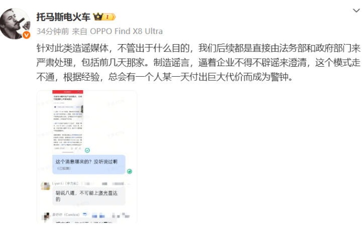 7月28日,有消息称小鹏汽车考虑产品线整合,后续可能重新上车激光雷达。对此,小鹏汽车副总裁@托马斯电火车发文表示,“针对此类造谣媒体,不管出于什么目的,我们后续都是直接由法务部和政府部门来严肃处理,包括前几天那家。制造谣言,逼着企业不得不辟谣来澄清,这个模式走不通,根据经验,总会有一个人某一天付出巨大代价而成为警钟。”