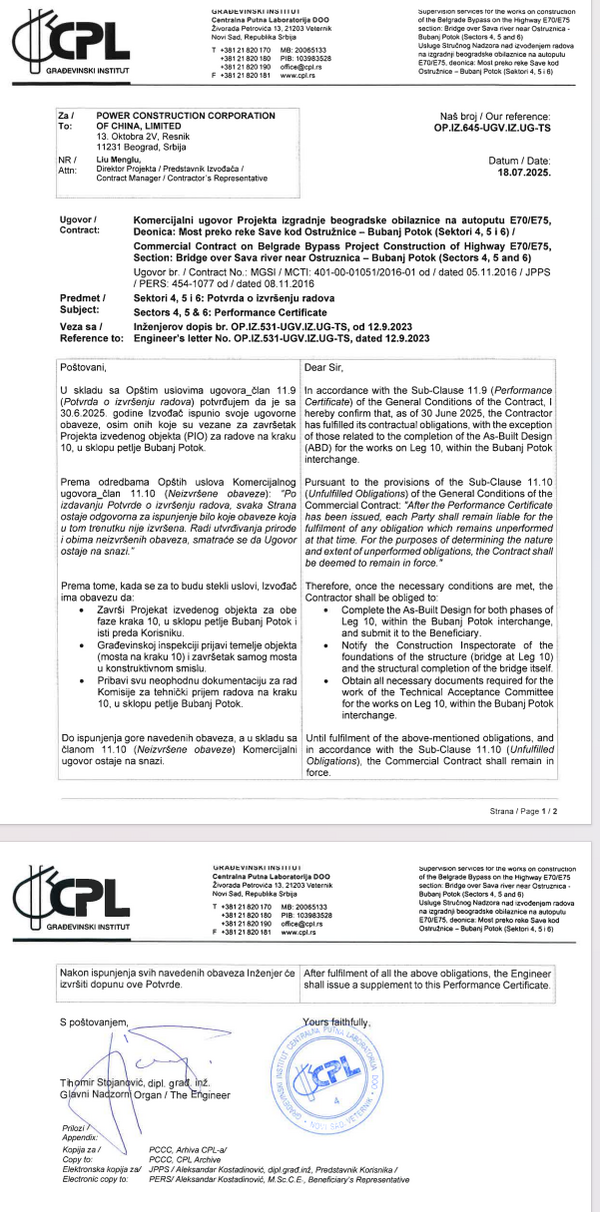 日前,由中国电建水电五局承建的塞尔维亚贝尔格莱德绕城公路项目收到了业主颁发的履约证书,标志着这一备受瞩目的重大项目圆满完成,并正式画上了完美的句号。