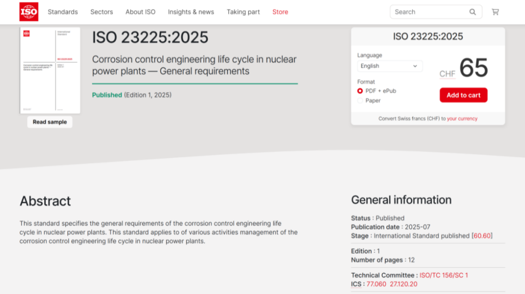 7月28日,由苏州热工研究院有限公司材料工程技术中心主导制订的国际标准ISO 23225:2025 Corrosion control engineering life cycle in nuclear power plants— General requirements(中文译名:核电厂腐蚀控制工程全生命周期通用要求)正式发布。该标准成为中国广核集团在核电领域首个主导制订并成功发布的国际标准。