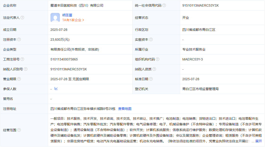 爱企查显示,近日,蜀道丰田氢能科技(四川)有限公司成立,法定代表人为胡圣厦,注册资本2.36亿人民币,经营范围包括电池制造、电池销售、汽车零配件批发、电动汽车充电基础设施运营等。股东信息显示,该公司由丰田汽车公司、蜀道装备、蜀道投资集团有限责任公司共同持股。