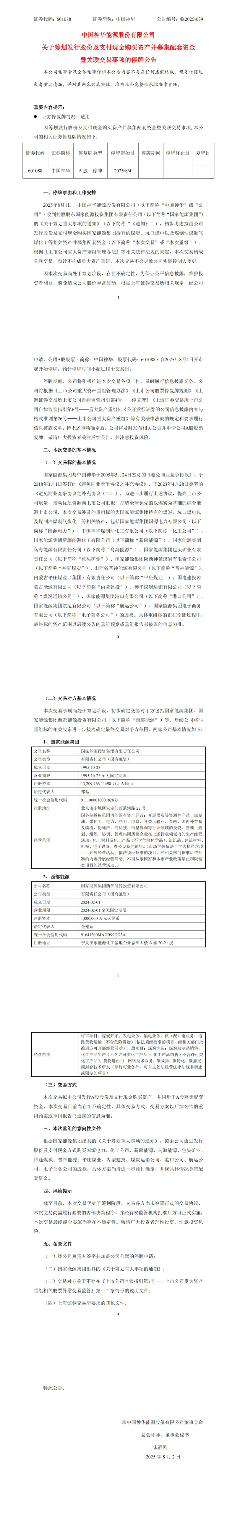 8月1日,中国神华能源股份有限公司(以下简称“中国神华”或“公司”)发布《关于筹划发行股份及支付现金购买资产并募集配套资金暨关联交易事项的停牌公告》称,中国神华收到控股股东国家能源投资集团有限责任公司(以下简称“国家能源集团”)的通知,初步考虑拟由公司发行股份及支付现金购买国家能源集团持有的煤炭、坑口煤电以及煤制油煤制气煤化工等相关资产并募集配套资金 。