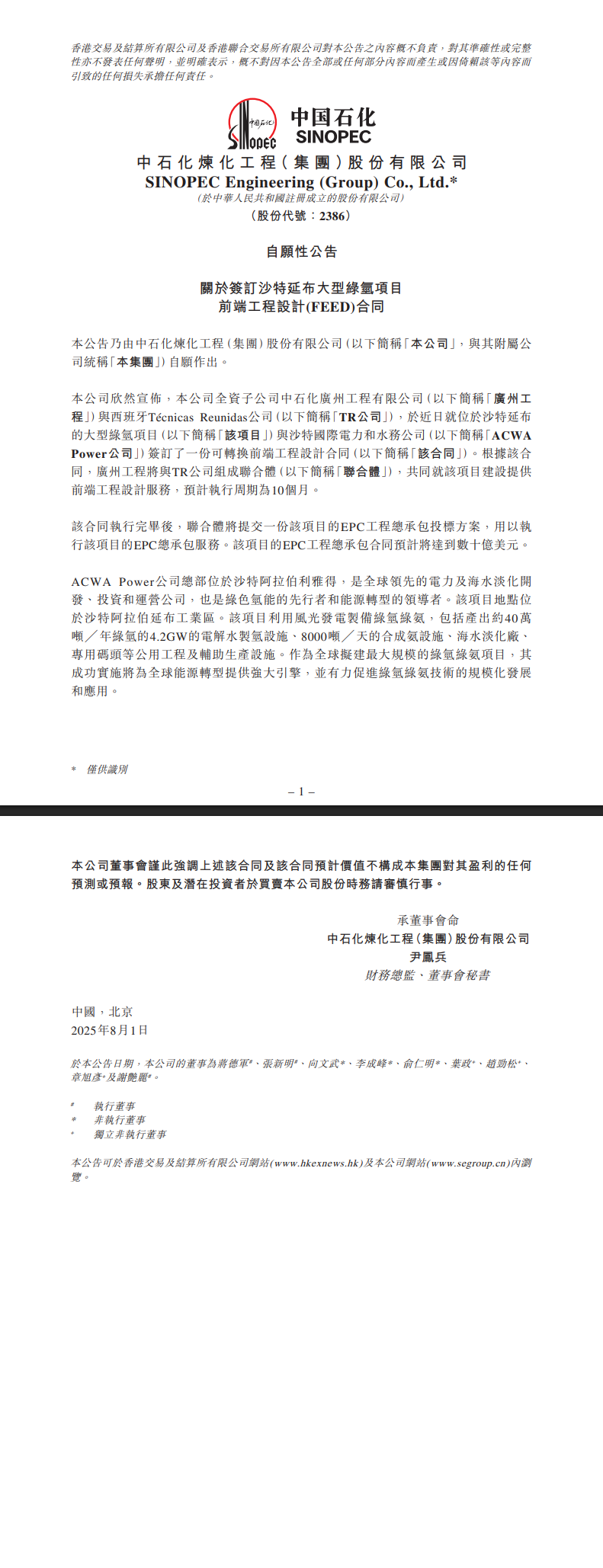 8月1日,中石化炼化工程发布公告,公司的全资子公司中石化广州工程有限公司与西班牙Técnicas Reunidas公司于近日签订了位于沙特延布的大型绿氢项目的前端工程设计合同。根据合同,广州工程将与TR公司组成联合体,共同提供前端工程设计服务,预计执行周期为10个月。合同执行完毕后,联合体将提交该项目的EPC工程总承包投标方案,预计EPC工程总承包合同将达到数十亿美元。