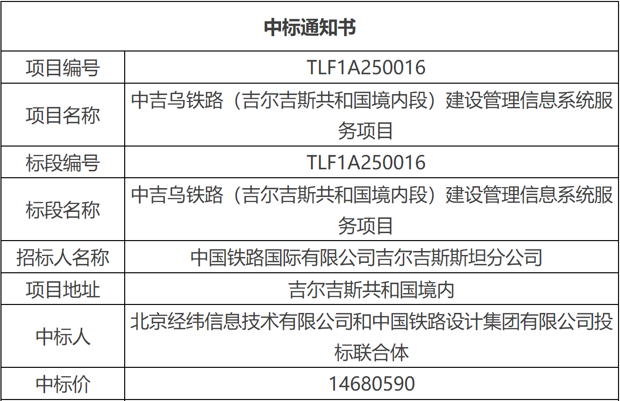 8月1日,中吉乌铁路(吉国境内段)建设管理信息系统服务项目中标结果公示。中标人为北京经纬信息技术有限公司和中国铁路设计集团有限公司投标联合体,中标价约1468万元人民币。合同范围包括建设管理平台、应用模块、数据中心、系统运维。