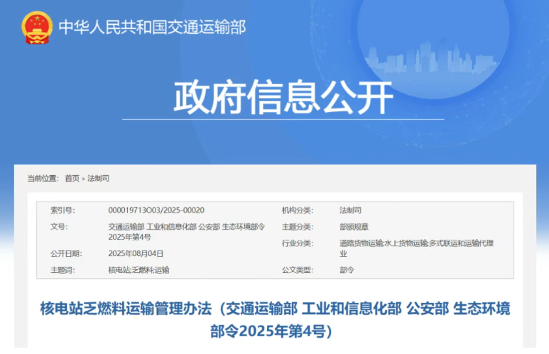 《核电站乏燃料运输管理办法》已于2025年6月12日经交通运输部第15次部务会议通过,并经工业和信息化部、公安部、生态环境部同意,现予公布,自2025年10月1日起施行。