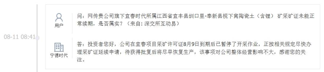宁德时代8月11日在互动平台称,公司在宜春项目的采矿许可证于8月9日到期后,已暂停开采作业,目前正依照相关规定尽快办理采矿证延续申请,待获批后将尽早恢复生产,此事项对公司整体经营影响不大。