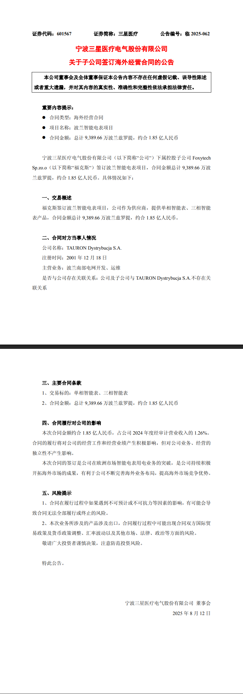 8月11日,三星医疗发布公告,公司的控股子公司福克斯签订了波兰智能电表项目的海外经营合同,合同金额总计9,389.66万波兰兹罗提,约合1.85亿元。该合同的签订标志着公司在欧洲市场智能电表用电业务的突破,有利于公司进一步开拓海外市场,提高竞争优势。