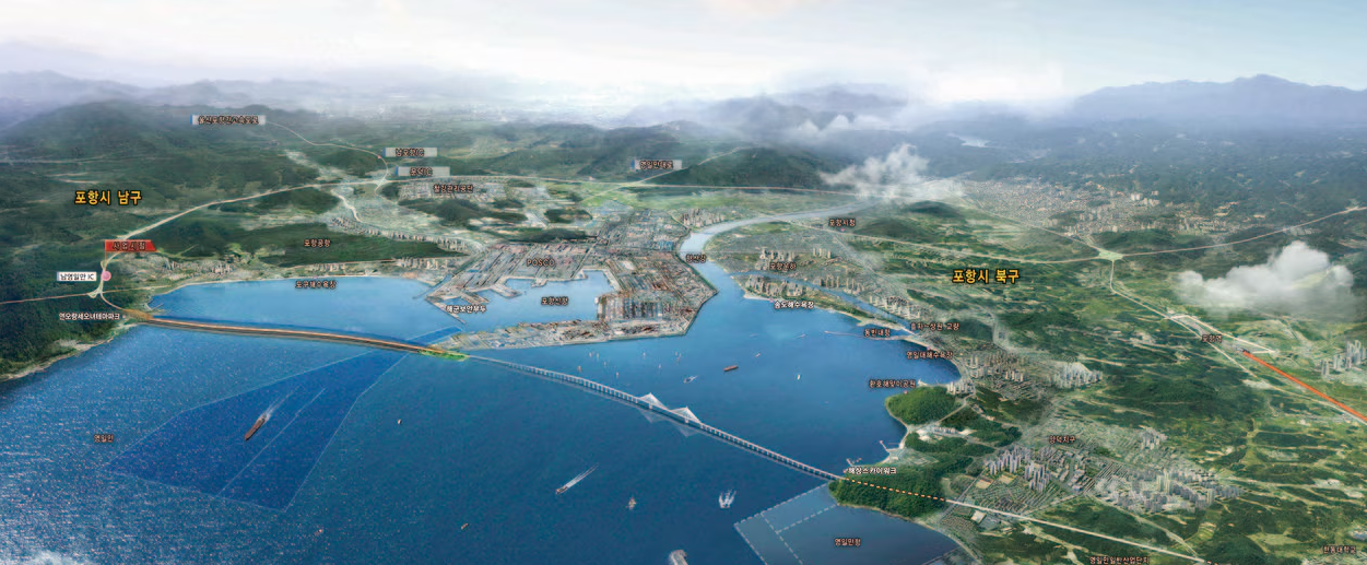 同和市推进在迎日湾大桥中间修建人工岛、向北建跨海大桥、向南建海底隧道的计划;中央政府则因预算原因,提出在北部建跨海大桥,南部沿兄山江河岸修路并与蔚山浦项高速公路连接的计划。