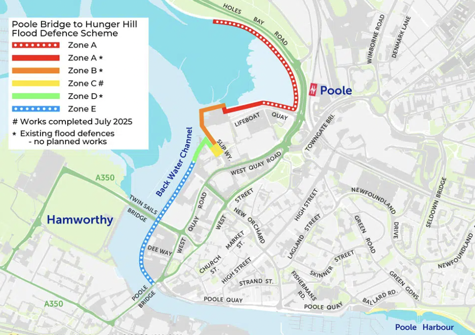 工程本月已在A区(霍尔斯湾路径至救生艇码头)开工,施工内容是将堤岸和岩石护岸抬高至2.65米AOD。E区(RNLI停车场至普尔桥)将于秋季完工,该区域将配备3.6米钢管和板桩墙以及防洪闸。两个部分的工程大约需要18个月。