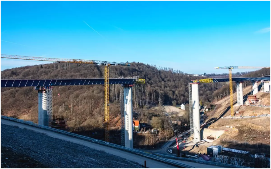 两台利勃海尔340 EC-B 16平头起重机,正在德国A45高速公路上新建的拉赫米德河谷大桥(Rahmede Valley Bridge)开展安全、精准且高效的吊装作业。