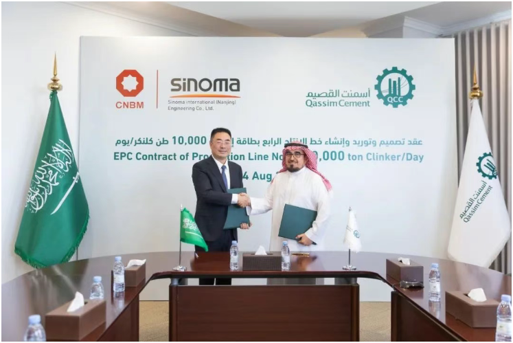 8月14日,中材国际(南京)与沙特卡西姆水泥公司(QCC)在沙特卡西姆省布赖代市举行QCC四号线日产10000吨熟料水泥生产线总承包合同签约仪式,同步签约的还有QCC天然气管道输送工程总承包合同和QCC商混站总承包合同。中材国际(南京)党委书记、董事长林忠与QCC首席执行官Omar先生代表双方公司签约,双方团队代表共同见证了这一重要时刻。