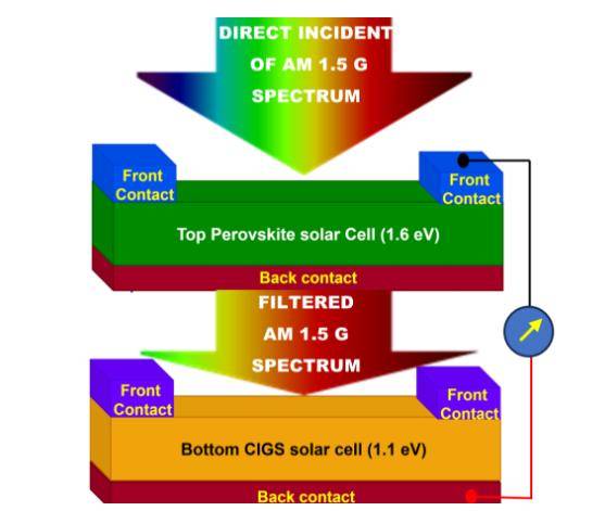印度维斯韦斯瓦拉亚国家技术学院的研究团队成功模拟出一种基于无铅卤化物钙钛矿与铜铟镓硒(CIGS)的串联太阳能电池。该新型太阳能电池顶部采用能带隙为1.6 eV的钙钛矿(CsGeI3)电池,底部则是能带隙为1.1 eV的CIGS电池,形成双端器件结构,潜在转换效率高达26.06%。