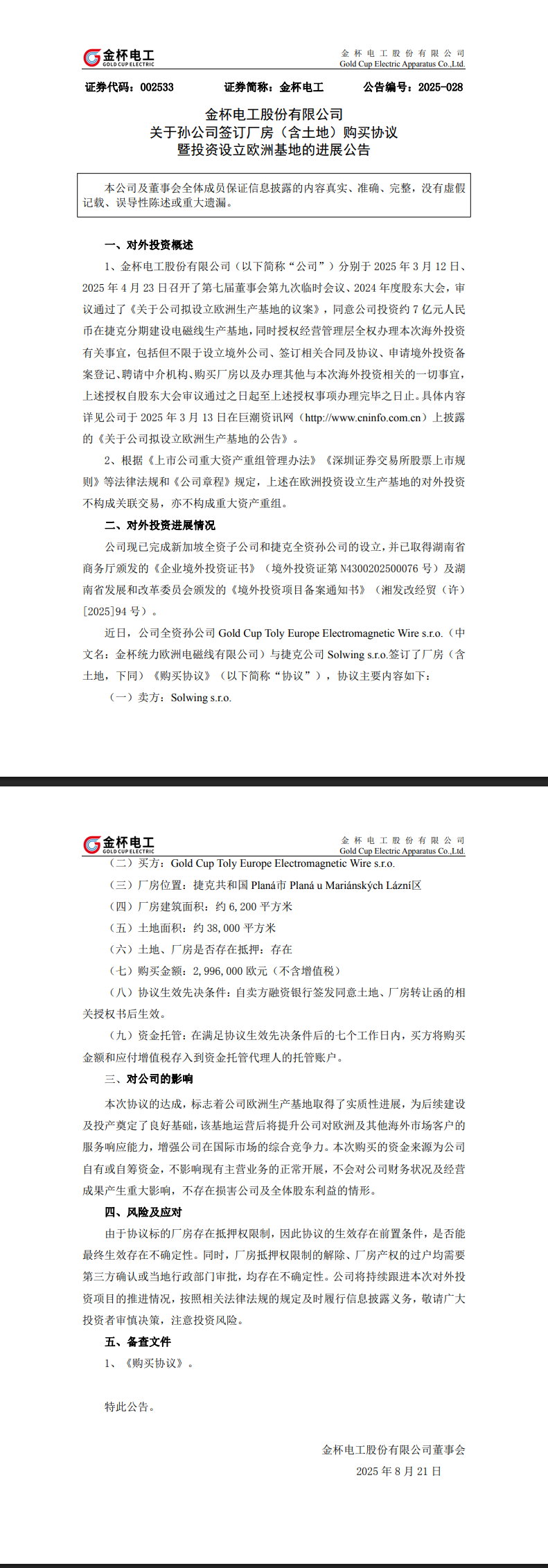 金杯电工公告,公司全资孙公司Gold Cup Toly Europe Electromagnetic Wires.r.o.中文名:金杯统力欧洲电磁线有限公司)与捷克公司Solwings.r.o.签订了厂房(含土地)购买协议,购买金额为299.6万欧元(不含增值税),厂房位置位于捷克共和国 Planá市 Planá u Mariánských Lázní区,厂房建筑面积约6,200平方米,土地面积约 38,000平方米。该协议标志着公司欧洲生产基地取得了实质性进展,为后续建设及投产奠定了良好基础。此次购买的资金来源为公司自有或自筹资金,不影响现有主营业务的正常开展,不会对公司财务状况及经营成果产生重大影响。