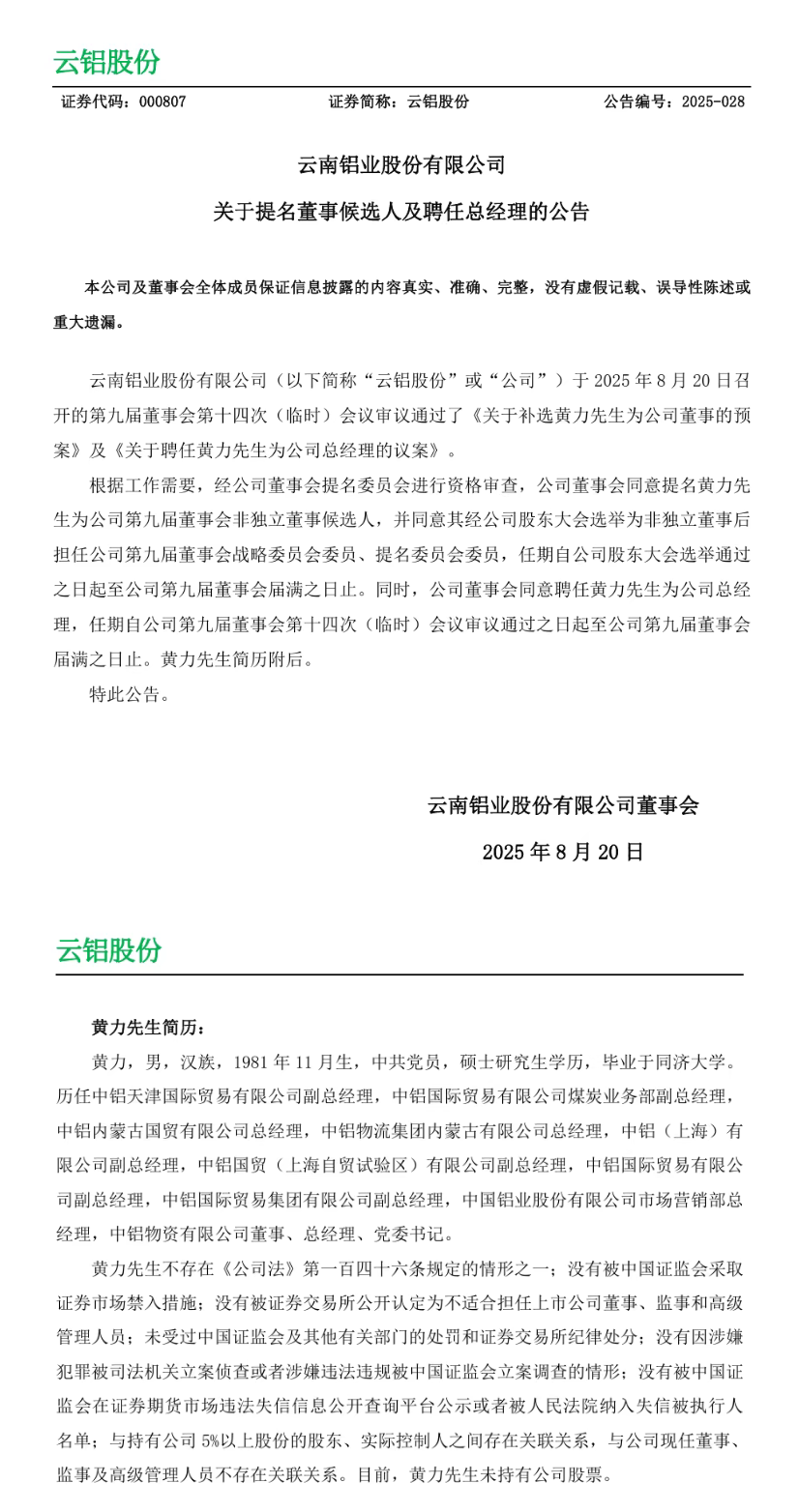 云铝股份发布公告称,公司于8月20日召开的第九届董事会第十四次(临时)会议审议通过了《关于补选黄力先生为公司董事的预案》及《关于聘任黄力先生为公司总经理的议案》。