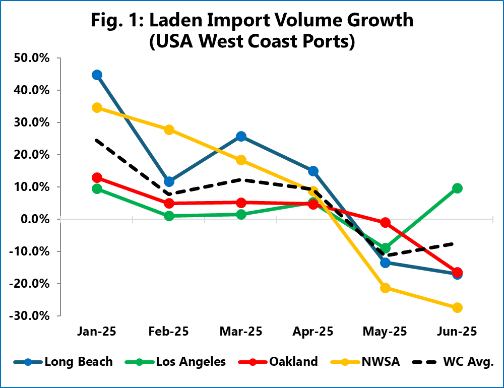 西北海港联盟(西雅图和塔科马)经历了最大幅度的波动,从1 月份的+34.7% 的增长率下降到6 月份的-27.3%。