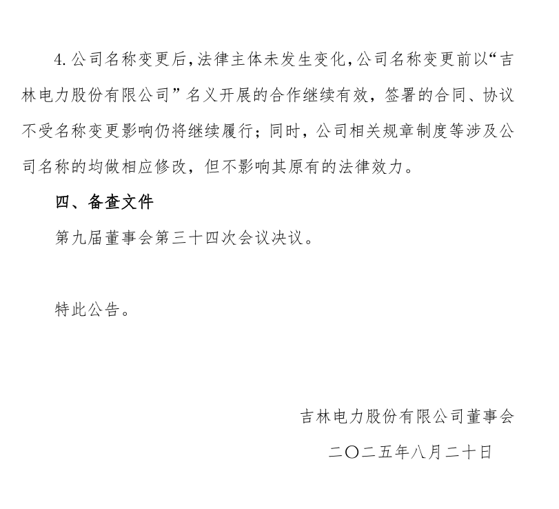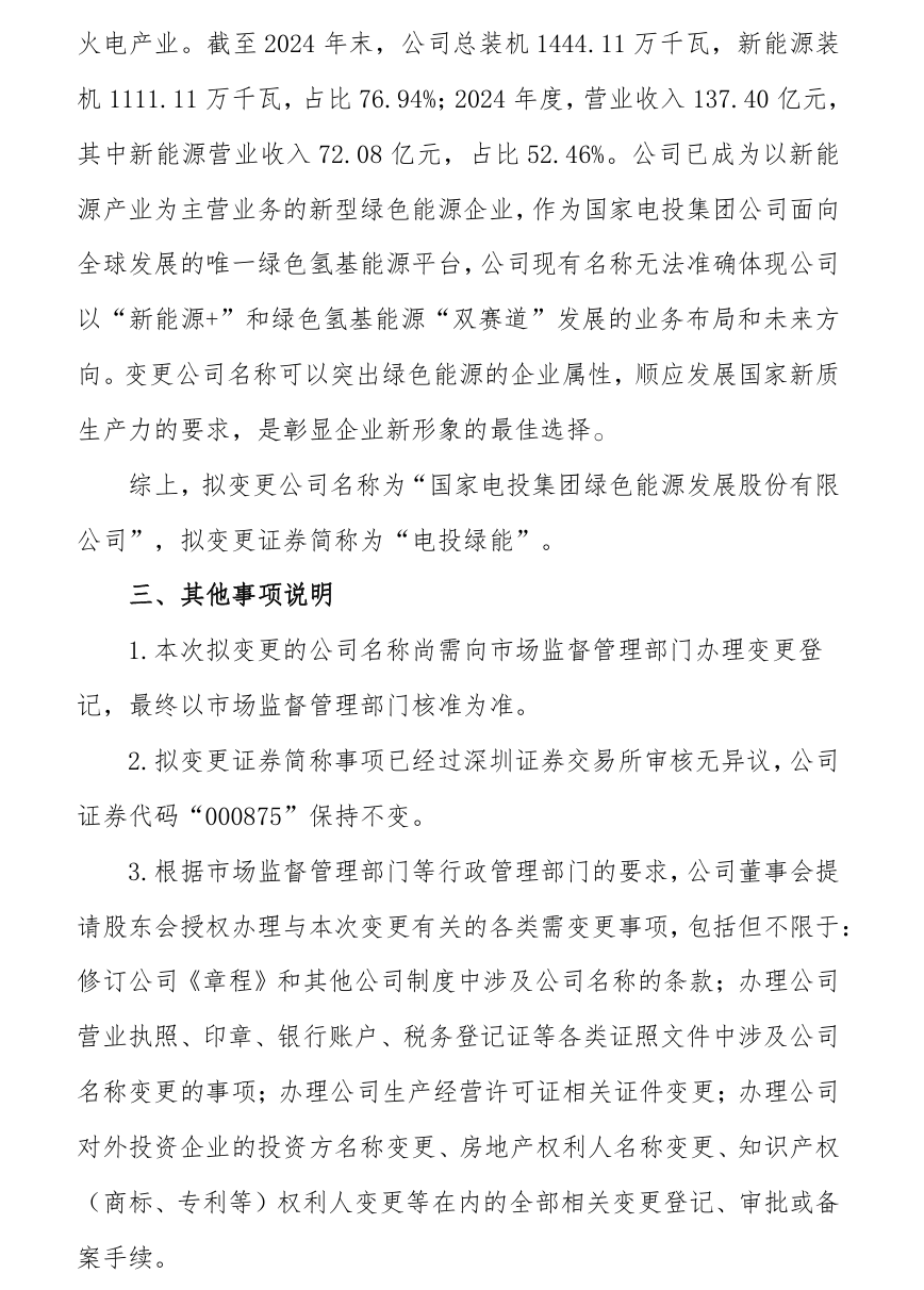 吉电股份发布公告称,公司于8月20日召开第九届董事会第三十四次会议,审议通过了《关于变更公司名称及证券简称的议案》,拟变更公司名称为“国家电投集团绿色能源发展股份有限公司”,拟变更证券简称为“电投绿能”。