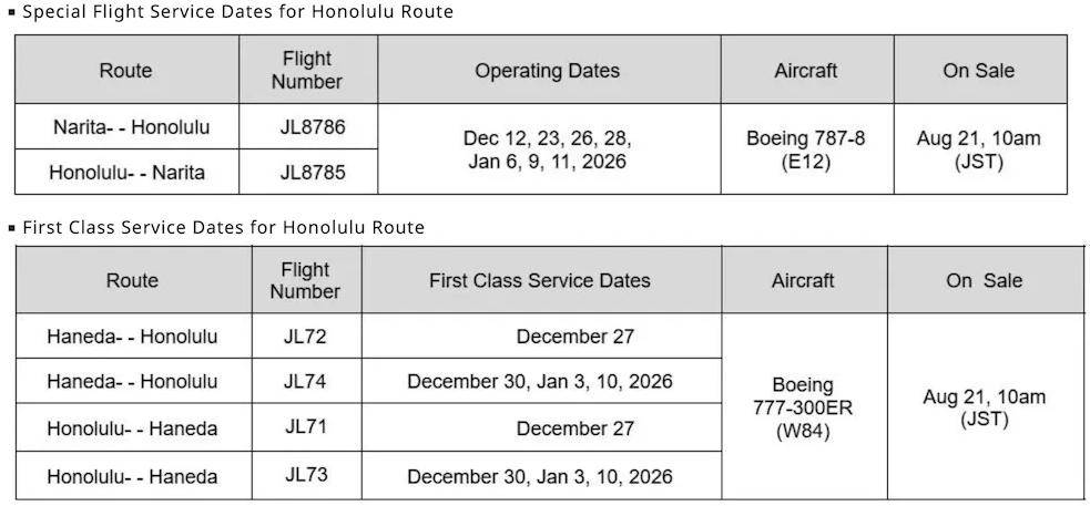为应对日本海外旅行需求的复苏,我们将增加航班并部署更大的飞机,以满足2025年12月14日日航檀香山马拉松赛以及年末年初期间的休闲需求。这些航班将提供头等舱服务。具体日期如下:
