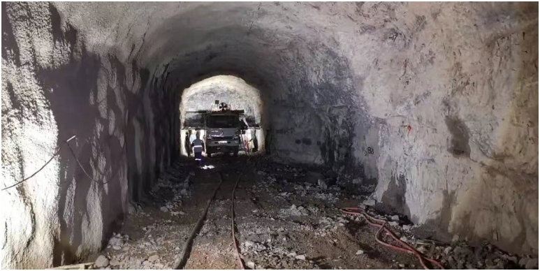 主斜坡道是矿山生产系统的关键通道,承担矿石、废石运输以及人员、设备、材料输送任务,同时兼做辅助进风通道。该斜坡道设计标准高、施工难度大,平均坡度11%–12%,局部最大坡度达14.5%,转弯半径20米,缓坡段坡度控制在2.5%。工程基建期将延伸至630米中段联络巷,总长度1613米。720米水平以上设两处错车硐室,以下与各分段联通,系统结构复杂,技术要求严格。